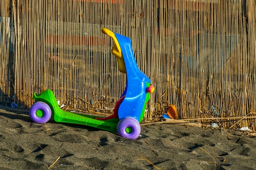 Tag: giocattolo, sabbia, monopattino, verde, ruote, canne, blu, viola, plastica.