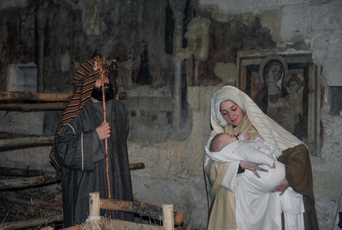 Altri tag (senza riscontro): donna, uomo, persone, presepio, gesù, maria, velo, statue, figuranti, stalla, maternità.
