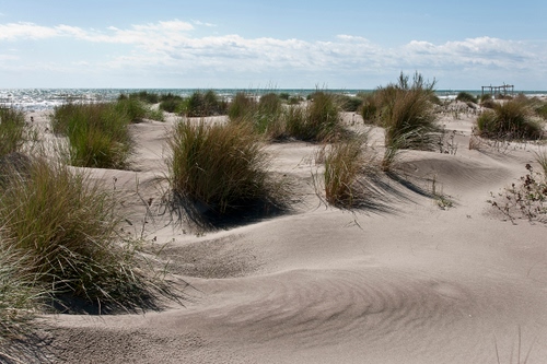 Tag: sabbia, cespugli, dune, spiaggia, mare, cielo, erba, nuvole, orizzonte, verde.