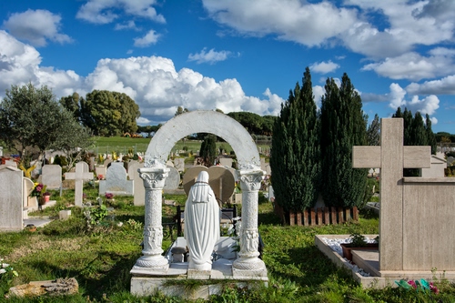 Tag: croci, cimitero, alberi, tombe, nuvole, cielo, bianco, lapidi, azzurro, verde, arco, cipressi, statua, colonne, statue.
