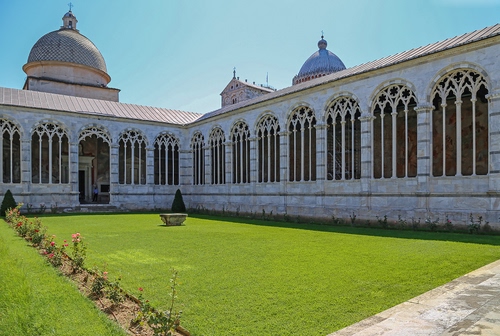 Tag: cupole, prato, erba, fiori, colonne, verde, archi, cielo, finestre, chiesa, chiostro, pisa, piante, camposanto, porta, cimitero, aiuola, colonnine.