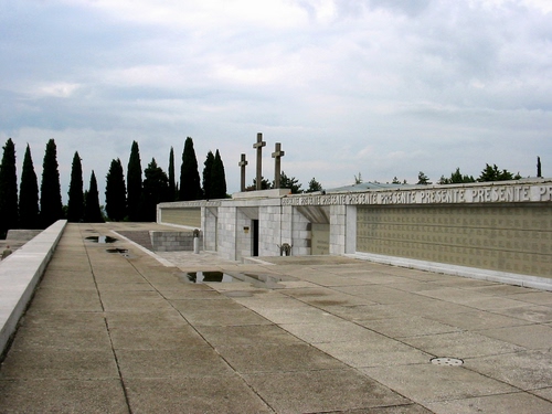 Tag: croci, alberi, cimitero, nuvole, cielo, cipressi, tre, sacrario, monumento, lapidi, scritte, verde.