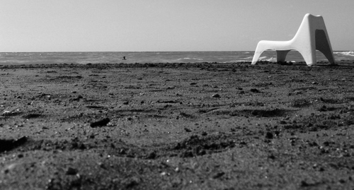 Sabbia rovente sul mezzo del giorno, il bagnante e la poltrona che lo attende.