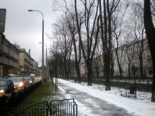 Le vie di Cracovia in gennaio. La neve nel viale pedonale crea un'atmosfera di tranquillità mentre nella strada spicca il traffico.