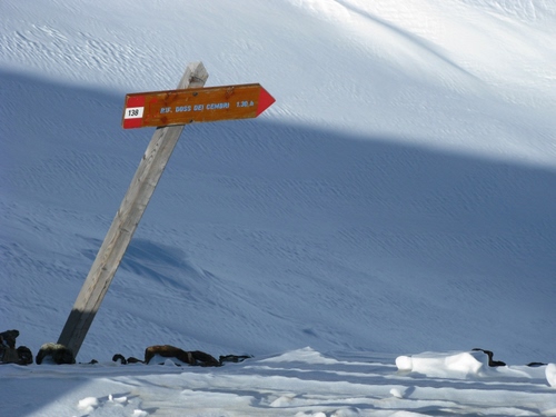 Cartello segnavia indica la direzione del sentiero coperto di neve. Sarà per la prossima estate.