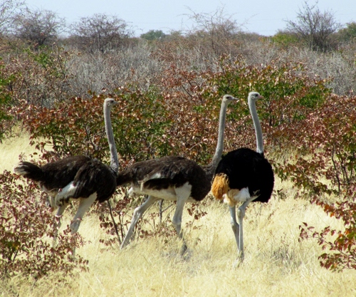 Tag: struzzi, tre, piume, uccelli, savana, zampe, nero, vegetazione, collo, africa, cespugli, colli.