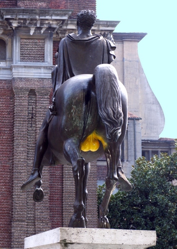 Ciao, sai che io queste cose non le faccio, è la statua equestre di Regisole davanti al Duomo di Pavia sembra una tradizione degli universitari pavesi. Buona serata Dominique Giovanni |