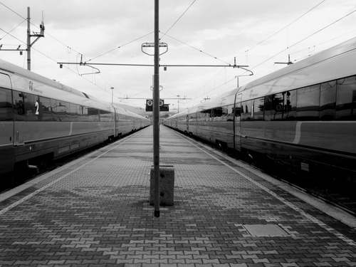 Tag: stazione, treni, bianconero, fili, due, marciapiede, ferrovia, binari, banchina, vagoni, pali, treno.