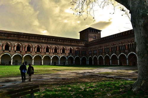 Ci si trova dentro le mura del Castello Visconteo di Pavia. Da fuori sembra il solito castello, ma una volta entrati si apre alla vista un enorme giardino con alberi e panchine. Subito si prova a immaginare quell'immenso spazio brulicante di carri e cavalli, il rumore dei fabbri e l'odore dello sterco… La domanda sorge spontanea: chissà come doveva essere ai tempi del suo massimo splendore?