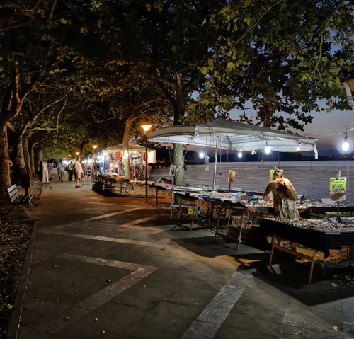 Tag: alberi, bancarelle, lampioni, luci, persone, foglie, mercato, ombrelloni, ombrellone, rami, panchina, verde, strada, acqua, viale, panchine, mercatino, tavoli, sera.