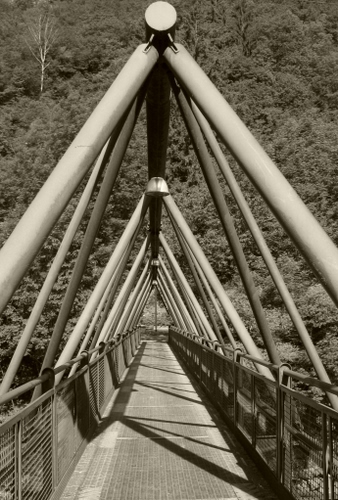 Tag: ponte, bianconero, passerella, tubi, prospettiva, ringhiere, geometrico, alberi, ferro.