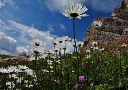 Ti ringrazio, ma è solo fortuna del dilettante. Con la mia piccola bridge ho solo studiato l'inquadratura e scurito un po', il resto l'ha fatto il soggetto,cioè un bel gruppo di margheritone vicino al Rifugio Averau, sopra il Passo Giau. |