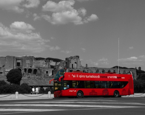 Tag: rosso, autobus, ruderi, roma, bus, strada, nuvole, desaturazione, rovine, cielo, bianconero.