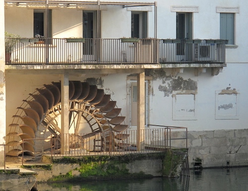 Lungo il corso del fiume Bacchiglione, nella città di Vicenza, presso il Ponte Pusterla, questa ruota non più funzionante resta a ricordare la tipografia F.lli Rumor, alla cui famiglia appartenne l'onorevole Mariano, rappresentante della DC, che fu anche Presidente del Consiglio.