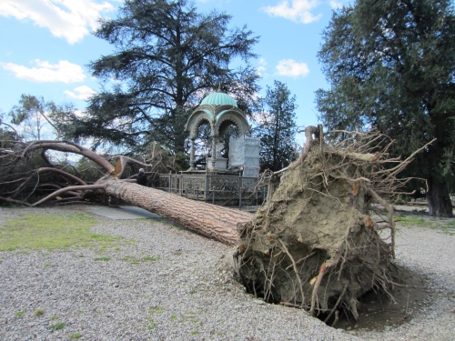 Pino abbattuto durante la grande tempesta del 2015 nelle Cascine, sfiorendo la tomba dell'indiano.
