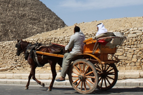 Carrozzella a Giza, tra le famose Piramidi (sullo sfondo uno scorcio di quella di Cheope).
