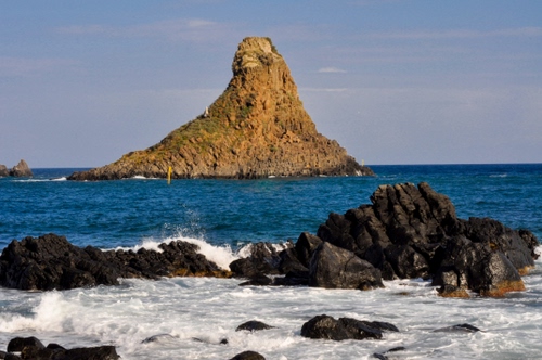 Bellissimo il contrasto rocce nere su spuma e isolotto assolato su azzurro ![]() |