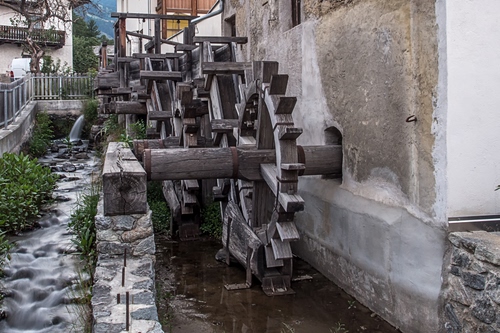 Tag: acqua, ruote, mulino, legno, canale, verde, muro, pale, pietra, erba, piante, muretto, pali, case, ingranaggi.