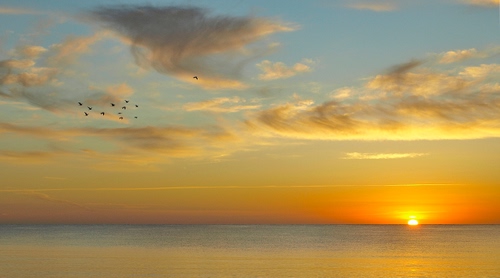 Tag: mare, tramonto, uccelli, nuvole, sole, cielo, acqua, arancio.