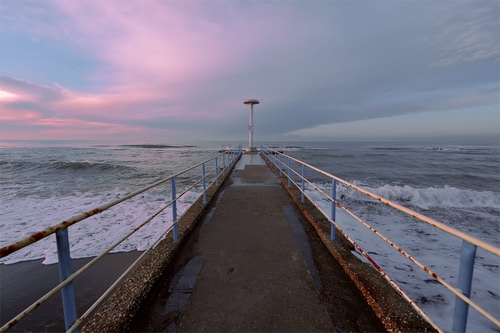 Tag: mare, molo, onde, nuvole, pontile, cielo, acqua, ringhiera, spiaggia, lampione, prospettiva.