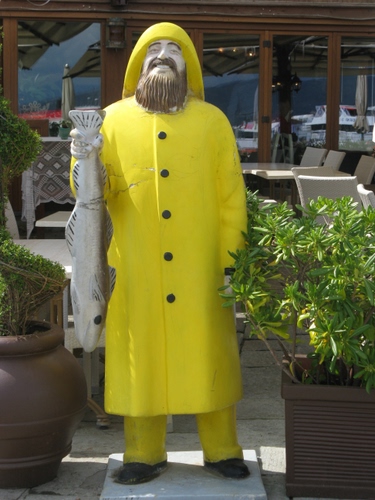 Tag: giallo, pesce, pescatore, statua, barba, vasi, piante, impermeabile, ristorante.
