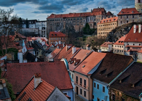 Tag: tetti, nuvole, cielo, comignoli, abbaini, finestre, case, alberi, palazzi, tegole, castello, panorama, città, rosso.