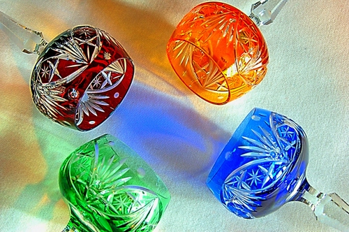 Tag: bicchieri, quattro, calici, colori, cristallo, vetro, incisioni, multicolore, verde.