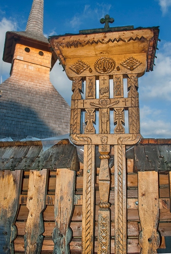 Carateristica croce ortodossa che solitamente orna edtrrnamente le chiese in legno della Transylvania.