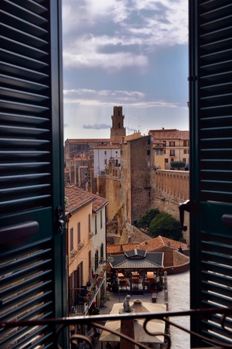 Tag: cielo, nuvole, finestra, torre, ringhiera, persiane, tetti, affaccio, piazza, case, finestre, balcone, imposte, scorcio, borgo, porta, mura, azzurro, campanile.