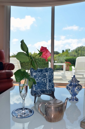 Abbinamento del bicchiere con rosa e ceramiche antiche.
