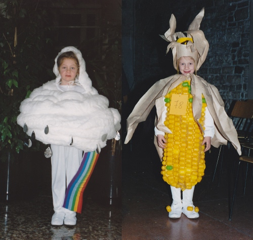 costumi realizzati in casa, la pannocchia, in particolare, con i contenitori delle sorprese degli ovetti kinder