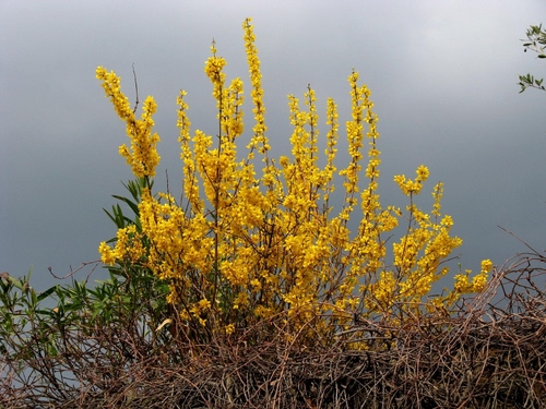 Il giallo dei fiori risalta contro un cielo grigio primaverile