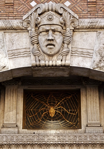La Casa del Ragno o il Palazzo del Ragno è uno dei palazzi di Quartiere Coppedè a Roma (che sono sicura ti farebbe piacere visitare e fotografare). Da Wikipedia: Palazzo del Ragno Il palazzo è sito in piazza Mincio 4 e risale al 1916-1926. Il nome è dovuto dalla decorazione sul portone d'ingresso principale. È suddiviso in quattro piani. Consta di una torretta. Al terzo livello vi è un balconcino con loggia. Sopra di esso vi è un dipinto color ocra e nero raffigurante un cavallo sormontato da un'incudine tra due grifoni sormontato dalla scritta «Labor». Sul prospetto di via Tanaro vi è effigiato il motto «Maiorum exempla ostendo/artis praecepta recentis» https://it.wikipedia.org/wiki/Quartiere_Copped%C3%A8#/media/File:Portone_del_Palazzo_del_ragno_-_copped%C3%A8.JPG.JPG |