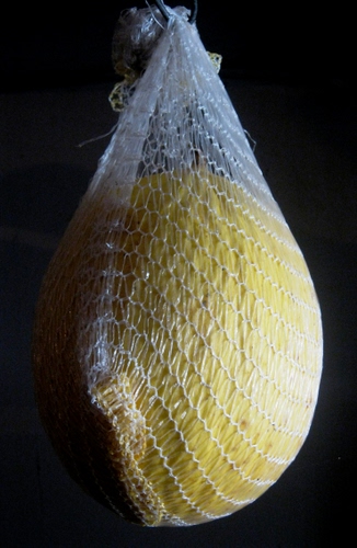 Melone giallo appeso a maturare dentro una reticella.
