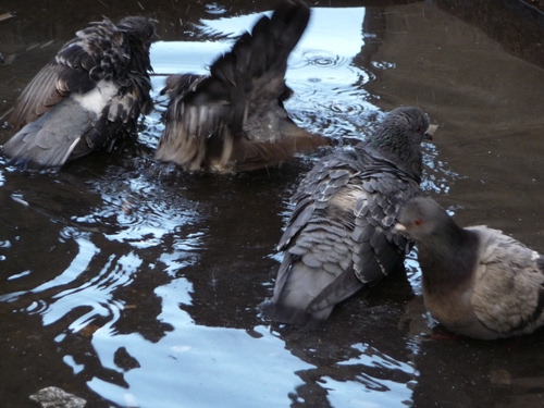 ho fotografato questo gruppo di piccioni che stavano lavandosi in una pozza di acqua