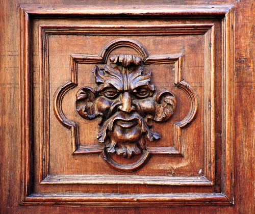 Tag: legno, porta, mascherone, quadrato, marrone, viso, quadrati, scultura, naso, faccia, portone, dettaglio, volto, bassorilievo, orecchie, barba, intarsio, testa.
