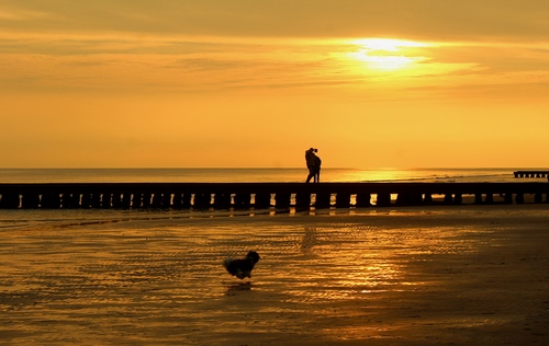 Tag: tramonto, mare, sole, pontile, cielo, nuvole, acqua, persone, molo, coppia, alba, giallo, panorama, uccello.