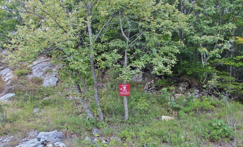 Agosto 2017, salita da Suica a Kupres (BiH), dopo più di vent'anni dalla guerra, in zona si trovano ancora parecchi di questi cartelli inchiodati sugli alberi anche in prossimità di villaggi. Questo si trova a tre metri dalla strada.