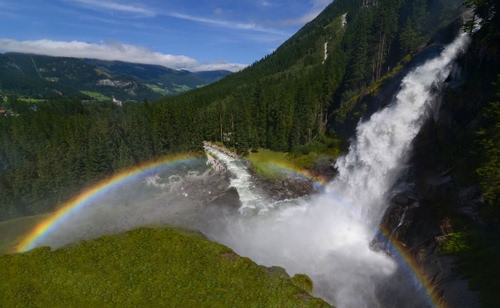 Ho aggiunto delle interessanti informazioni su queste straordinarie cascate. La foto è stata scattata alle 14.30 circa da uno dei diversi punti panoramici lungo i 4 km del sentiero delle cascate di Krimml, da dove si possono ammirare da vicino, e in tutta sicurezza, le fragorose masse d'acqua, oltre a bagnarsi completamente In una giornata di sole l'arcobaleno (anche doppio - nelle altre mie immagini) si forma sempre ed è talmente intenso che sembra finto.... provare per credere ...