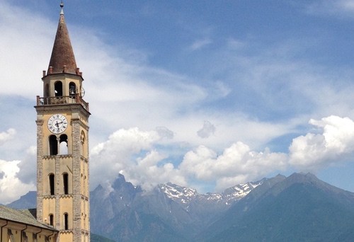 Cielo azzurro, due campanili e montagne innevate