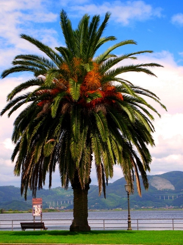 Tag: panchina, palma, lampione, verde, albero, nuvole, cielo, erba, ringhiera, montagne, prato, pianta, foglie, cartello, colline, lago, datteri, rami, parapetto, acqua, panorama, mare.