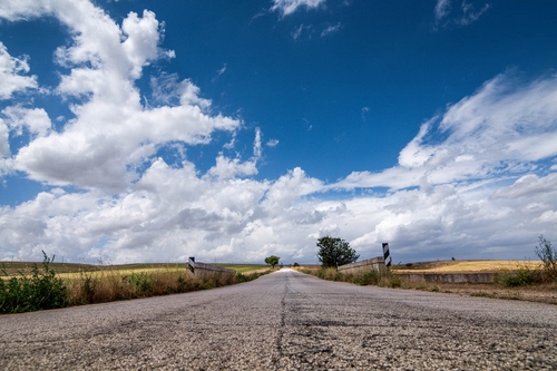 Tag: strada, nuvole, cielo, asfalto, azzurro, alberi, bianco, prospettiva, campi, panorama, erba, cespugli, albero, ponte, giallo.