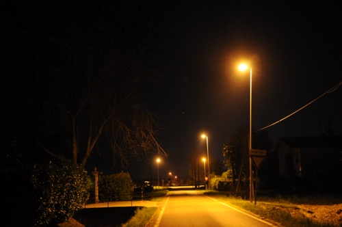 Lampioni che come guardiani silenziosi sorvegliano la strada.
