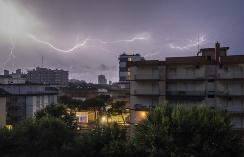 Tag: alberi, luci, palazzi, cielo, fulmini, temporale, fulmine, nuvole, antenne, verde, case, finestre, maltempo, città, balconi, lampi, panorama, pioggia.