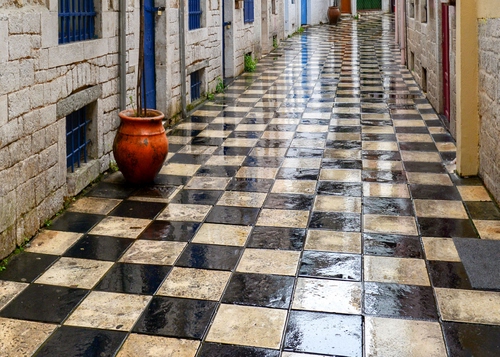 Tag: vaso, vicolo, nero, piastrelle, bianco, strada, porte, finestre, scacchi, riflesso, pioggia, quadrati, vasi, riflessi, blu, bagnato, inferriate, bianconero, geometrie.