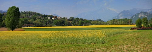 Tag: giallo, alberi, prato, panorama, campi, montagne, verde, fiori, campo, erba, paesaggio, albero, colza.