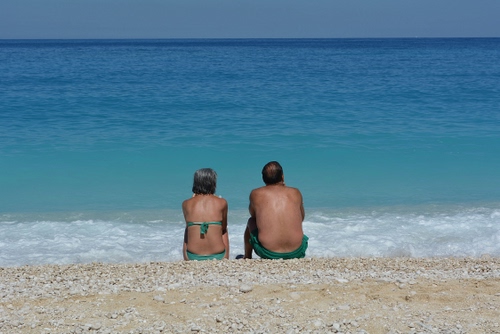 Tag: mare, spiaggia, donna, coppia, uomo, azzurro, sabbia, due, orizzonte, costume, acqua, schiuma, sassi, onde, seduti, bagnanti, cielo, blu, persone.