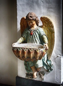 https://it.wikipedia.org/wiki/Acquasantiera "Le acquasantiere non vanno confuse con il fonte battesimale, grande contenitore d'acqua benedetta (acqua lustrale) usato per i battesimi" |