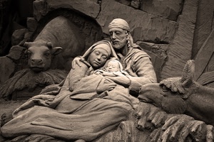 Bepi e Maria cun Gjesùbambin, il toru e il mùs a stàn a cjalàiu.