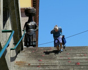 quello ceh colpisce in quest'immagine (bravo) è la figura ritta della scultura in opposizione con la postura fortemente incurvata della donna dovuta alla vecchaia